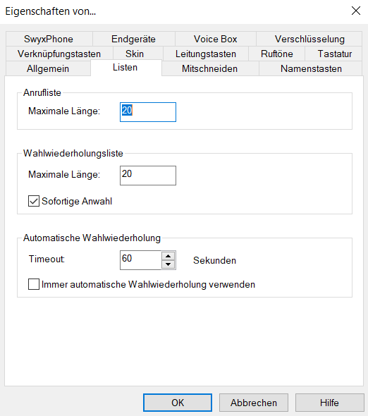 Mit Hilfe dieser Registerkarte konfigurieren Sie die Anrufliste und das Verhalten der Wahlwiederholung.