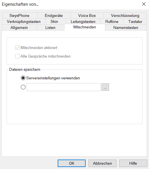 Standardmäßig werden die Gespräche auf Ihrem PC unter Anwendungsdaten oder in einem vom Administrator festgelegten Verzeichnis abgelegt. Dieses Verzeichnis können Sie ändern, wenn dies vom Administrator zugelassen wird. Außerdem können Sie erkennen, ob alle Gespräche mitgeschnitten werden, oder ob Sie Ihre Gespräche selbst bedarfsgerecht aufzeichnen können. Die entsprechenden Kontrollkästchen sind ausgeblendet, da die Einstellungen nur durch den Administrator geändert werden können.