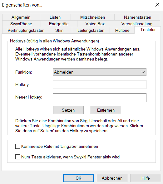 Mit Hilfe der Registerkarte „Tastatur“ können Sie sich individuelle Hotkeys für die wichtigsten SwyxIt! Classic Funktionen definieren.