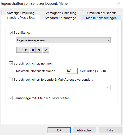 Bei der Installation hat der Ansagen-Assistent Sie bereits aufgefordert, die Begrüßungsansage für die Voice Box aufzusprechen - diese können Sie hier ändern.