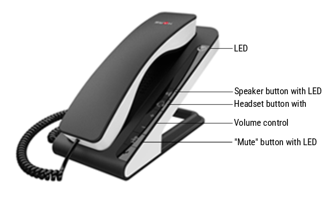 Use the "Plus" and "Minus" buttons to control the volume. Volume control affects the output source (headset, handset, and speakers) currently in use. The "Mute" button activates/deactivates the microphone currently in use. The "Headset" button enables headset mode. The "Speaker" button activates the device speaker.