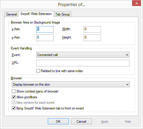 On the tab "SwyxIt! Web Extension" you can specify additional options such as the URL to be shown in the browser area and the event for which the Web content is loaded; or you can link the content to a specific line. You can also specify whether the contents should be displayed in a separate browser window or within the browser area defined on the skin.