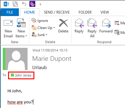 The status of another internal SwyxIt! Classic subscriber (e.g. ringing, speaking, logged on, away etc.) is displayed in MS Office applications (e.g. in Outlook) as a coloured box next to the name.