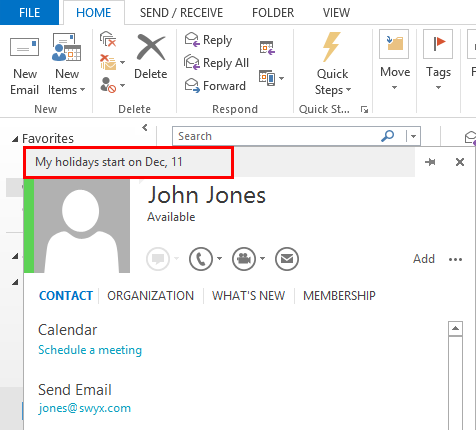 After installing the Communication Add-In, you can see the SwyxIt! Classic user status in the MS Office applications, you can make calls directly from MS Office contact cards, and you can see the SwyxIt! Classic status message.