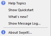 Show Quickstart | Displays the Quickstart document, which contains basic functional descriptions to assist you in your initial use of the SwyxIt! Classic functions. |