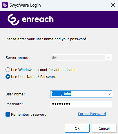 5 If you want SwyxIt! Classic to save your password, activate the checkbox Remember password. The logon to the server then takes place automatically in future, and the logon dialog is no longer displayed.