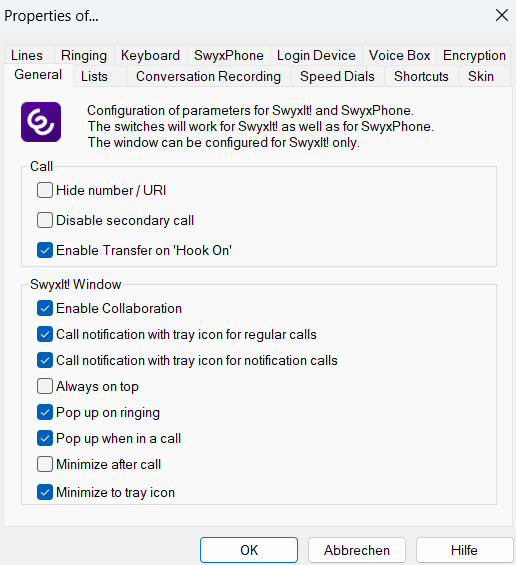 These settings only affect the behaviour of the SwyxIt! Classic window.