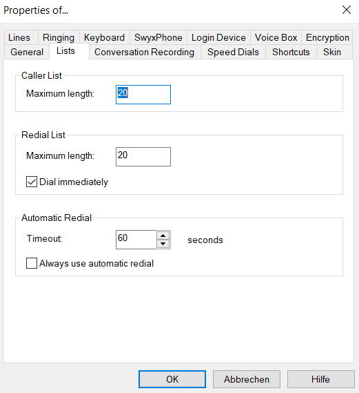 This tab is used to configure the Caller List and the behavior of Redial.