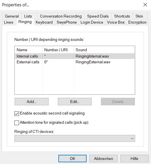 Depending on the number of the caller, SwyxIt! Classic can select different ringing sounds. Alternatively you can also enter your extension here. In this case it will ring differently depending on the extension called.