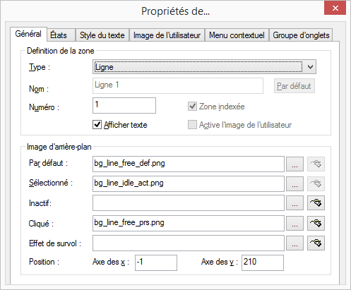 « Zone concernée » : Le fichier graphique utilisé à la place de l'image d'arrière-plan normale de la touche, lorsque celle-ci est active. Cette option est uniquement disponible pour les touches de ligne et les éléments d'onglets.