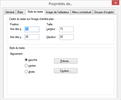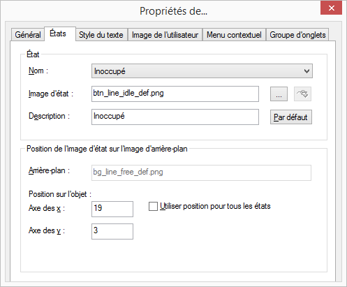 5 Sous « Position de l'image d'état sur la zone », entrez dans les champs « Axe x » et « Axe y » les coordonnées de l'image ou de l'animation AVI réprésentée à l'intérieur de la touche. L'origine des coordonnées se trouve dans le coin supérieur gauche de l'image d'arrière-plan de la touche.