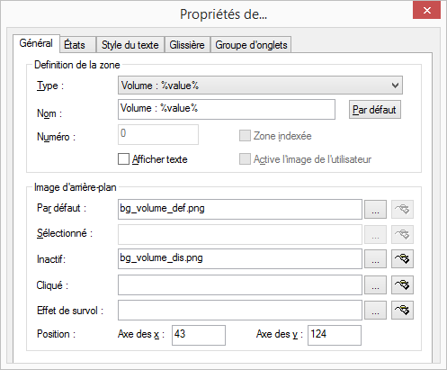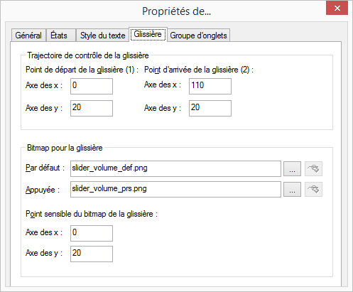 Pour régler le volume sonore, vous pouvez définir un curseur sur l'habillage. Un curseur dispose d'un point de départ et d'arrivée, d'une image d'arrière-plan ainsi qu'éventuellement d'un intitulé et d'un curseur réglable qui peut être déplacé.