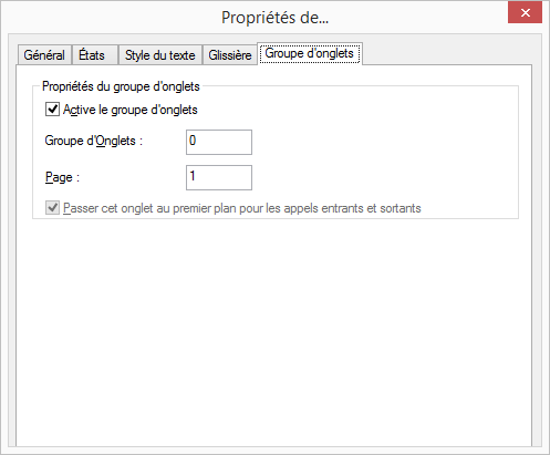 Vous pouvez regrouper des éléments de curseur sur des onglets. Vous devez entrer les informations sur le groupe et la page pour chaque élément que vous placez sous l'onglet.