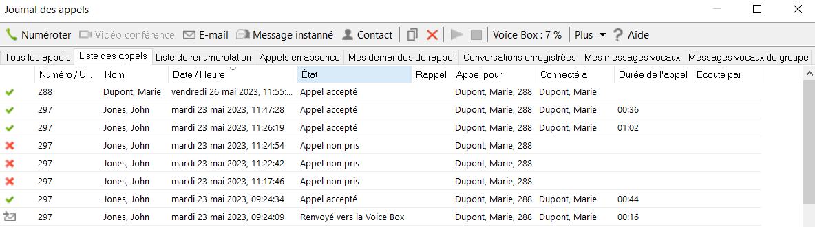La liste d'appels comprend les numéros de vos correspondants ainsi que leur nom (si connu), l'heure et la date de l'appel et l'état de l'appel (si l'appel a été pris ou transféré).