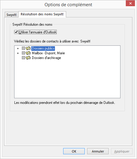 Sélectionnez l'onglet « Résolution de noms SwyxIt! ». Vous voyez tous les répertoires de contacts disponibles dans votre Outlook.