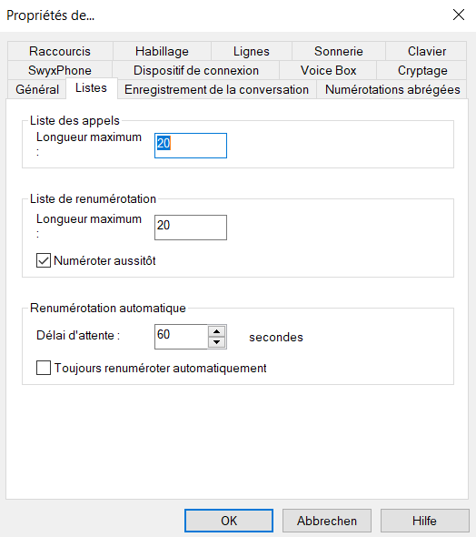 Cet onglet vous permet de configurer la liste des appels et le fonctionnement de la renumérotation.