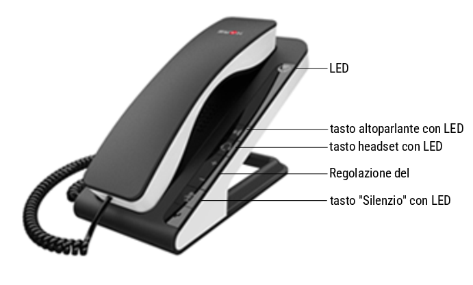 La regolazione del volume avviene con i due tasti "più" e "meno". La regolazione del volume produce il suo effetto sul dispositivo (headset, microtelefono e altoparlante) scelto per la diffusione della conversazione. Il tasto "Silenzio" attiva o disattiva il microfono usato per condurre la conversazione. Il tasto headset attiva la modalità headset. Il tasto "Diffusore" attiva l'altoparlante.