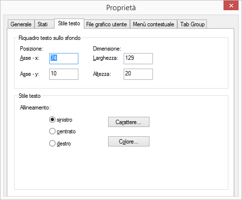 1 Nei campi "Asse x" e "Asse y" sotto "Riquadro testo sullo sfondo" si definisce la posizione del riquadro utilizzato per il testo all'interno dell'area di un tasto. L'angolo in alto a sinistra del file grafico che fa da sfondo al tasto, costituisce il punto "0" del sistema di coordinate.