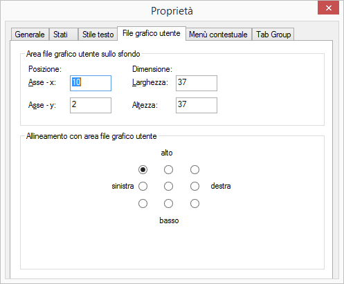 Avendo attivato sulla scheda "Generale" la casella che consente l'uso di un'immagine personalizzata, la presente scheda serve per definiere le proprietà del file grafico.