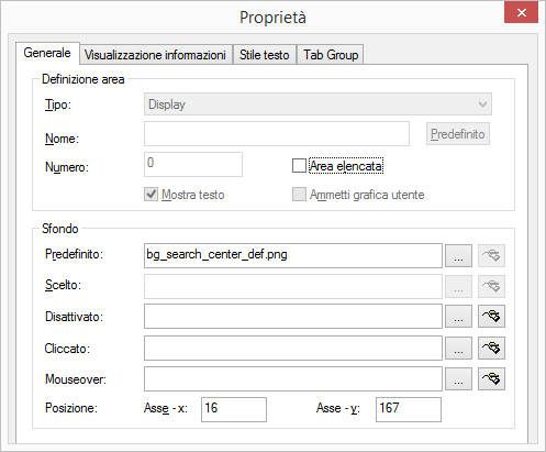 3 Mediante i campi "Asse‑x" e "Asse y" sotto "Posizione" si definiscono le coordinate dell'elemento display sulla superficie di SwyxIt! Classic. L'angolo in alto a sinistra, costituisce il punto "0" del sistema di coordinate.
