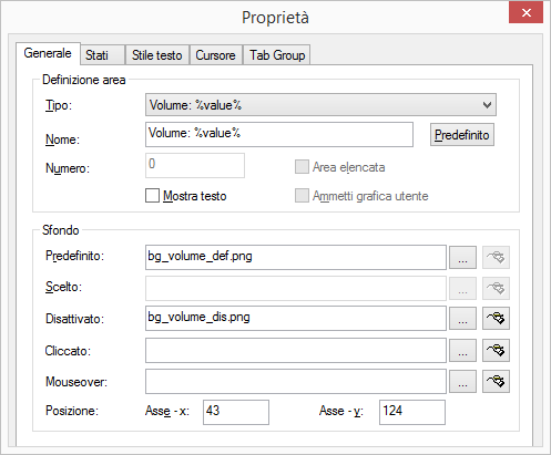 5 Nei campi "Asse x" e "Asse y" sotto "Posizione immagine stato sullo sfondo" si inseriscono le coordinate del file grafico o AVI all'interno del tasto. L'angolo in alto a sinistra del file grafico che fa da sfondo al tasto, costituisce il punto "0" del sistema di coordinate.