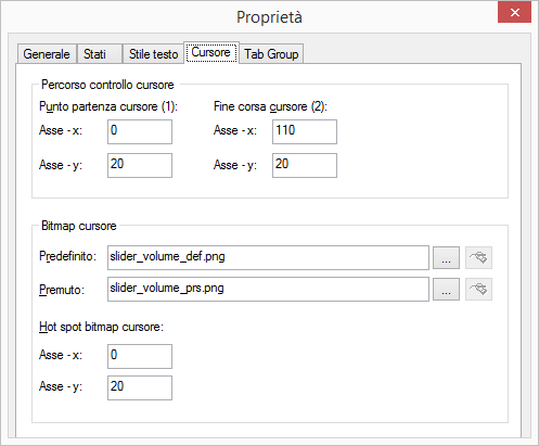 2 Sotto "Bitmap cursore" si definisce l'aspetto del tasto che verrà mosso sull'area di regolazione. E' possibile scegliere due diverse immagini, una per lo stato di riposo e una per lo stato attivo del tasto.