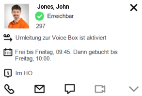 La scheda contatto contiene il nome dell'interlocutore, il suo stato e il suo numero telefonico. Se memorizzato verrà visualizzato anche il testo sullo stato. Se l'interlocutore ha impostato che l'oggetto di eventuali appuntamenti memorizzati nel calendario venga indicato come informazione relativa al proprio stato questo verrà visualizzato. Se un utente ha configurato una deviazione, questo viene visualizzato sulla scheda di contatto.
