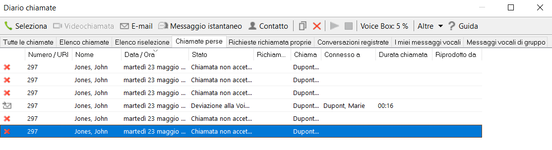 1 Fare doppio clic su tale icona nella system tray o cliccare sul tasto funzione "Diario chiamate" e aprire la scheda "Chiamate perse" per visualizzare l'elenco delle chiamate perse. Tutte le chiamate perse nuove vengono evidenziate in grassetto.
