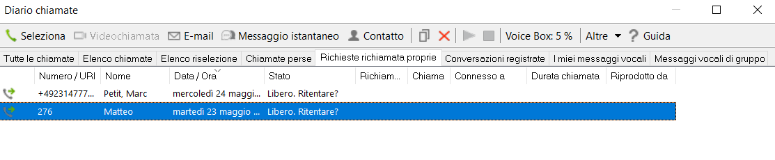 Instaurato il collegamento con l'utente, la relativa voce dell'elenco "Richieste richiamata proprie" è cancellata automaticamente.