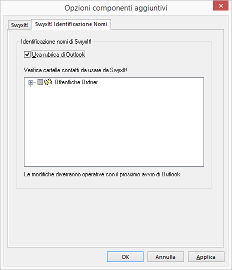 Scegliere la scheda "SwyxIt! Classic Identificazione nomi". Appariranno tutte le cartelle relative a contatti che è possibile scegliere in Outlook.