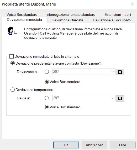 Attivata la deviazione alla Voice Box standard, verranno applicate le impostazioni configurate nella scheda "Voice Box standard".