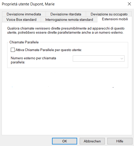 3 Barrare la casella "Attiva chiamate parallele per questo utente", se si desidera che chiamate in arrivo vengano segnalate anche presso un apparecchio esterno.