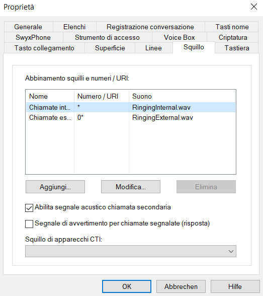 Con SwyxIt! Classic è possibile scegliere diversi tipi di squillo a seconda dell'utente che sta chiamando. In alternativa possono essere indicati anche i propri numeri interni. Lo squillo sarà differente in dipendenza dell'interno chiamato.