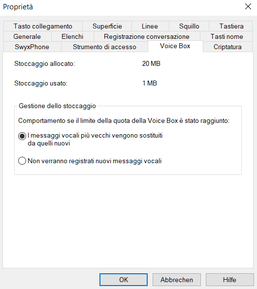 Sotto la scheda Voice Box è possibile visualizzare le informazioni sullo spazio di archiviazione dei messaggi vocali e impostare il comportamento da adottare quando si raggiunge il limite della quota. Per la gestione dello stoccaggio sono disponibili le seguenti opzioni: