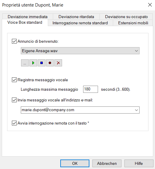 7 Attivare la casella di controllo Invia messaggio vocale al seguente indirizzo e-mail e inserire un indirizzo e-mail se i messaggi vocali ricevuti devono essere recapitati anche via e-mail. E' possibile indicare più indirizzi e-mail. Devono essere divisi da punto e virgola.