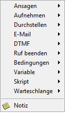 Ansagen | ![]() | Alle Blöcke in denen dem Anrufer Ansagen eingespielt werden: Siehe 2.6.6.3 Ansage spielen, siehe 2.6.6.4 Ansagenauswahl, siehe 2.6.6.5 Zeichenfolge ansagen, siehe 2.6.6.6 Datum ansagen, siehe |
