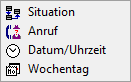 Bedingungen | ![]() | Alle Blöcke, in denen Entscheidungen nach definierten Bedingungen getroffen werden: Siehe 2.6.4.1 Situation, siehe 2.6.4.2 Anruf, siehe 2.6.4.3 Datum/Uhrzeit, siehe |