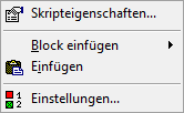 Skripteigenschaften... | Öffnet das Fenster der allgemeinen Skripteigenschaften. Hier kann der Skriptname, Autor und Beschreibung sowie die Blockdarstellung verändert werden. |