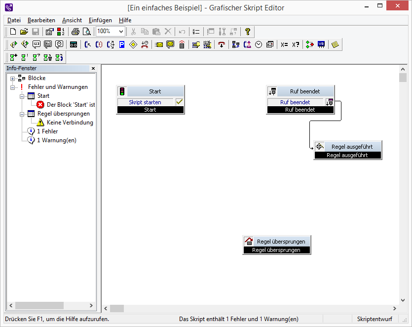 Sie können nun die von Ihnen gewünschten Blöcke auf der Rasteroberfläche im Skript-Fenster positionieren und die entsprechenden Parameter eingeben. Die Kontaktflächen aller Blöcke (der Eingang sowie alle Ausgänge) müssen verbunden sein. Im Info-Fenster sehen Sie die Meldungen über die Fehler und Warnungen. Diese geben z.B. Auskunft über noch fehlende Verbindungen oder Parameter.