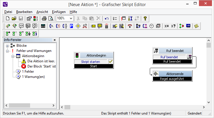 Es erscheint der Grafische Skript Editor. Auf der rechten Seite des Fensters sehen Sie bereits die Pflichtblöcke für die Regel: „Start“, „Regel ausgeführt“, „Regel übersprungen“ und „Anruf beendet“.