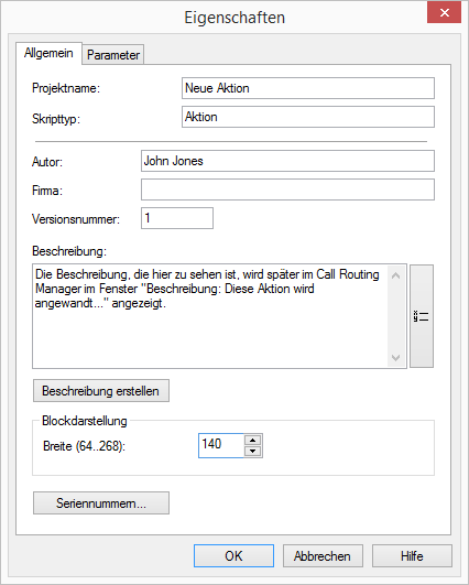 Unter „Beschreibung“ muss eine kurze Information eingegeben werden, welche die Funktion des Skripts beschreibt. Durch Klick auf „Beschreibung erstellen“ wird die Beschreibung durch den Grafischen Skript Editor generiert. Dieser Text erscheint später im Call Routing Manager im Fenster „Beschreibung: Diese Regel wird angewandt...“.