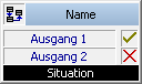 Auf der rechten Seite des Blocks finden Sie die Kontaktflächen für die Ausgänge. Sie sind ebenfalls mit Symbolen oder Abkürzungen belegt. Sie können für jeden Ausgang eine eigene Beschreibung festlegen. Diese werden im Block angezeigt. Die Zahl der Ausgänge ist abhängig vom Blocktyp, jeder Block hat mindestens einen Ausgang. Diese Ausgänge können von Ihnen mit dem Eingang des darauf folgenden Blocks verbunden werden.