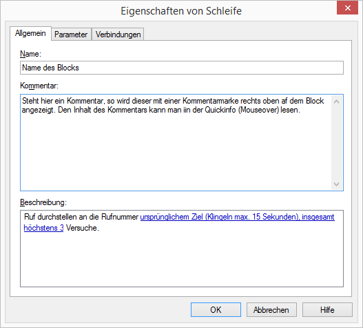 Es erscheint das Fenster „Eigenschaften von <Blockname>“ mit der gewählten Registerkarte, beispielsweise „Allgemein“.