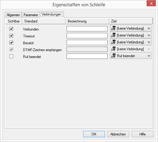 | In der Spalte „Sichtbar“ legen Sie lediglich die Sichtbarkeit der Verbindungen im Skript-Fenster fest. Diese Einstellung dient nur der Übersichtlichkeit eines Skripts. Entfernen können Sie Ausgänge nicht, d.h. die Verbindungen müssen trotzdem bestehen, da sonst ein Fehler im Skript auftritt. |