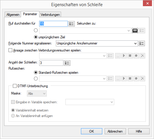 Im Block „Schleife“ aktivieren Sie die Eingabe einer anderen Rufnummer und klicken Sie für die Auswahl der Zielrufnummer z.B. auf