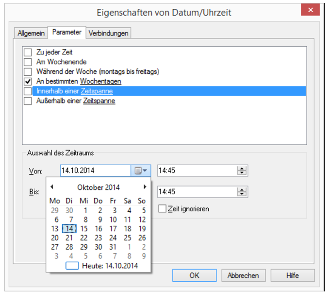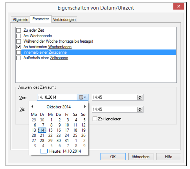 Zeitspanne2 Wählen Sie aus der Auswahlliste „Innerhalb einer Zeitspanne“ aus, so können Sie im unteren Teil der Registerkarte dann sowohl Datumszeiträume als auch Bereiche innerhalb der Tageszeit detailliert festgelegen.