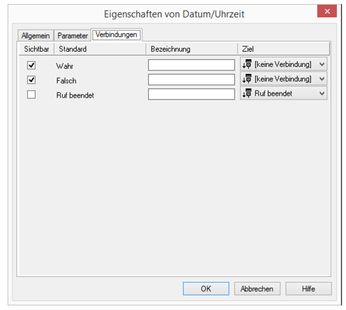 Dieser Block bietet die Möglichkeit, eine Entscheidung aufgrund des Anrufzeitpunktes zu treffen. Die Ausgänge werden im Folgenden beschrieben: