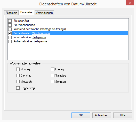 Wenn eine Bedingung zusätzliche Angaben verlangt (zum Beispiel einen Wochentag oder eine Uhrzeit), ist die entsprechende Angabe in der Bedingung unterstrichen.