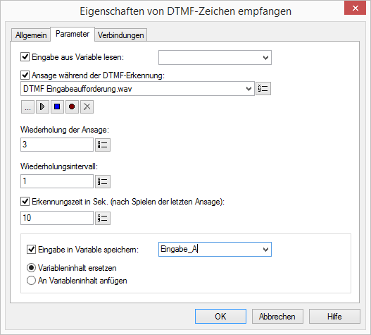 1 Aktivieren Sie die Option „Eingabe aus Variable lesen:“, wenn Sie hier statt der Eingabe des Anrufers ein Zeichen aus einer Variable einlesen möchten.