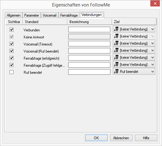 | In der Spalte „Sichtbar“ legen Sie lediglich die Sichtbarkeit der Verbindungen im Skript-Fenster fest. Diese Einstellung dient nur der Übersichtlichkeit eines Skriptes. Entfernen können Sie die Ausgänge nicht, d. h. die Verbindungen müssen trotzdem bestehen, da sonst ein Fehler im Skript auftritt. |